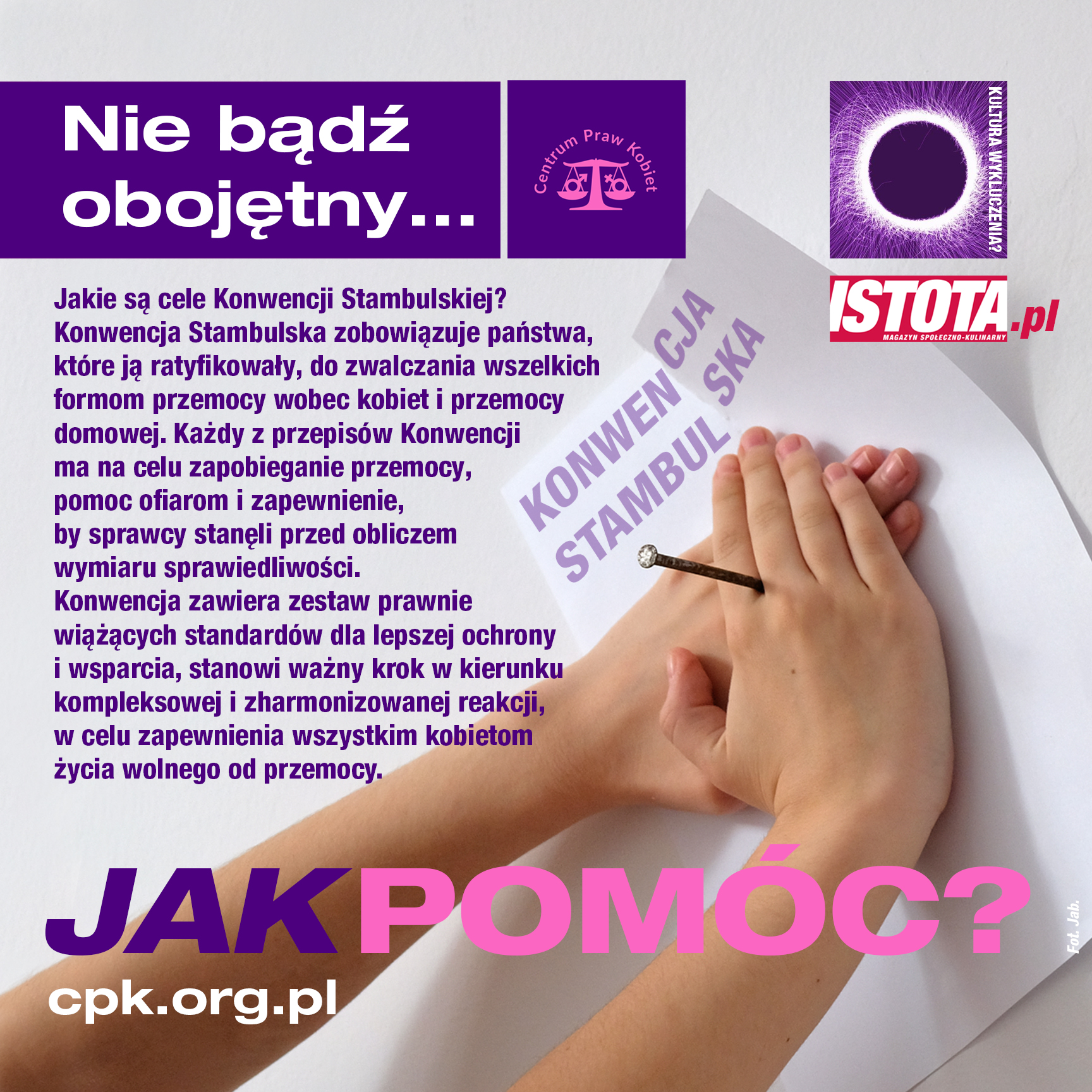 Konwencja Rady Europy o zapobieganiu i zwalczaniu przemocy wobec kobiet i przemocy domowej, zwana potocznie Konwencją Stambulską jest kompleksowym dokumentem o międzynarodowym znaczeniu wyznaczającym kierunek zmian. Dokument ten uznaje, że równouprawnienie kobiet i mężczyzn jest podstawowym warunkiem do zapobiegania przemocy wobec kobiet oraz, że to kobiety są bardziej narażone na przemoc ze względu na płeć. Celami konwencji jest ochrona kobiet, zapobieganie przemocy, ale także wsparcie dla specjalistycznych organizacji pomocowych. W Polsce te kwestie wciąż są niedoskonałe i niedopracowane, zarówno instytucje państwowe, jak i świadomość wielu ludzi przepełniona jest stereotypami krzywdzącymi dla kobiet. Konwencja wymaga, by to ochrona ofiar była priorytetem, by wdrażano wielostronne rozwiązania zapewniające im bezpieczeństwo, ale także prewencję.