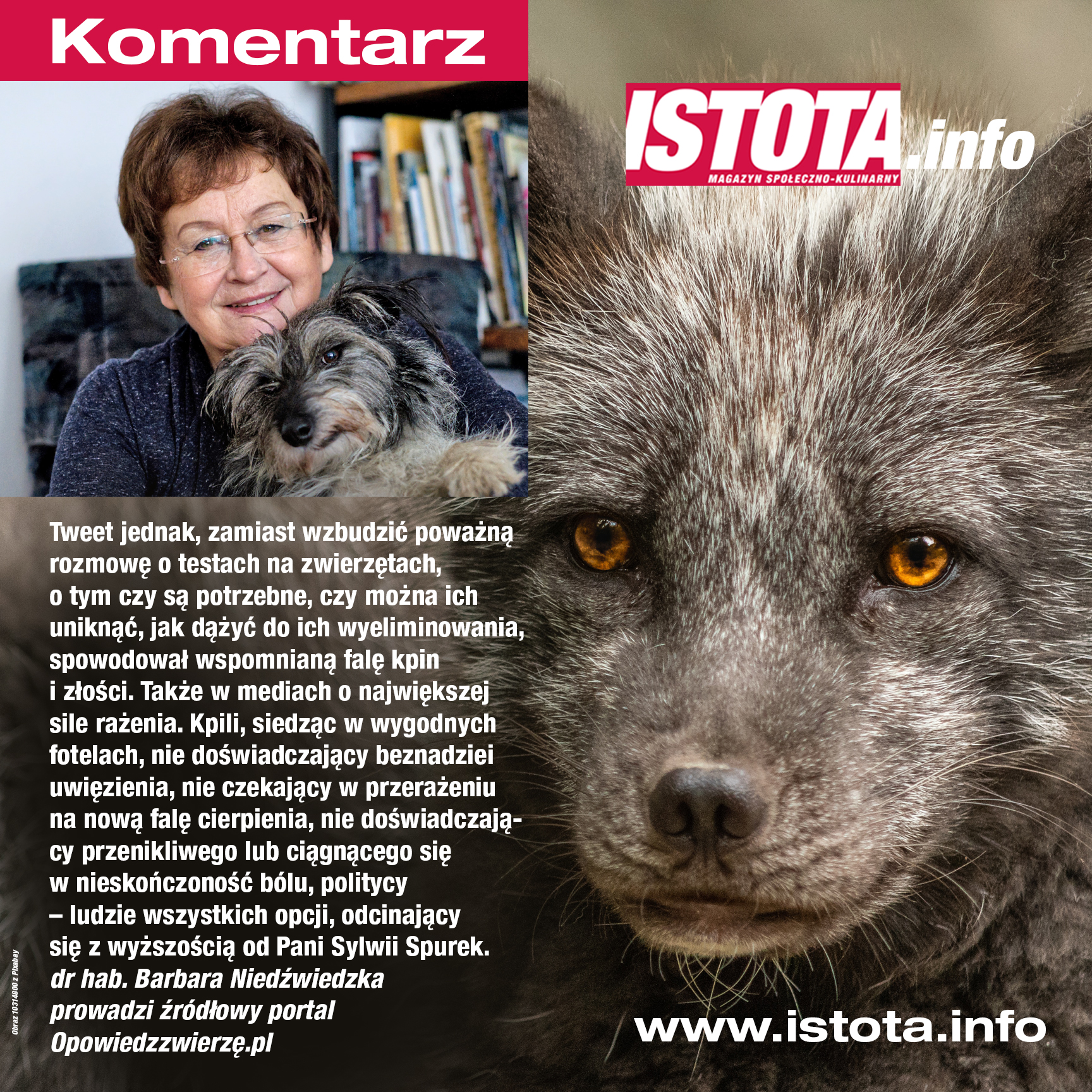 Oczywiście w takich razach mówi się o wszystkim, o rozmaitych krzywdach, jakich doświadcza człowiek, o eutanazji, aborcji, o groźnych chorobach, itd., choć tweet w najmniejszej mierze nie był poświęcony tym tematom. Zwracał uwagę na los zwierząt laboratoryjnych. Dlatego, pozwolicie Państwo, i ja innymi tematami się nie zajmę. Przyznam się, że nic bardziej mnie nie złości, jak to „albo albo”. Albo dobro ludzi albo dobro zwierząt. Albo prawo zwierząt do właściwego im dobrostanu, albo aborcja na żądanie. Ludzka manipulacja.