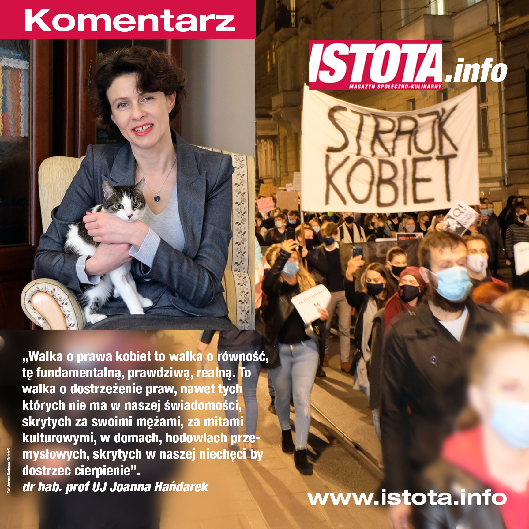 Karolina Kuszlewicz napisała bardzo ważny tekst o walce kobiet, która nie może skończyć się tylko ich sprawą. Walka o prawa kobiety ma stać się walką o przedstawicielki innych gatunków. I jest to bardzo ważna sprawa, ten głos nie może nam minąć nie zauważony. Walka o prawa kobiet sięga bowiem o wiele dalej i głębiej niż może nam się wydawać. Tu nie chodzi o sam feminizm, prawa reprodukcyjne czy koszmar kobiety skazanej na urodzenie dziecka po to by cierpiało kilka godzin swego życia. Walka o prawa kobiet to walka o równość, prawdziwą, realną równość.