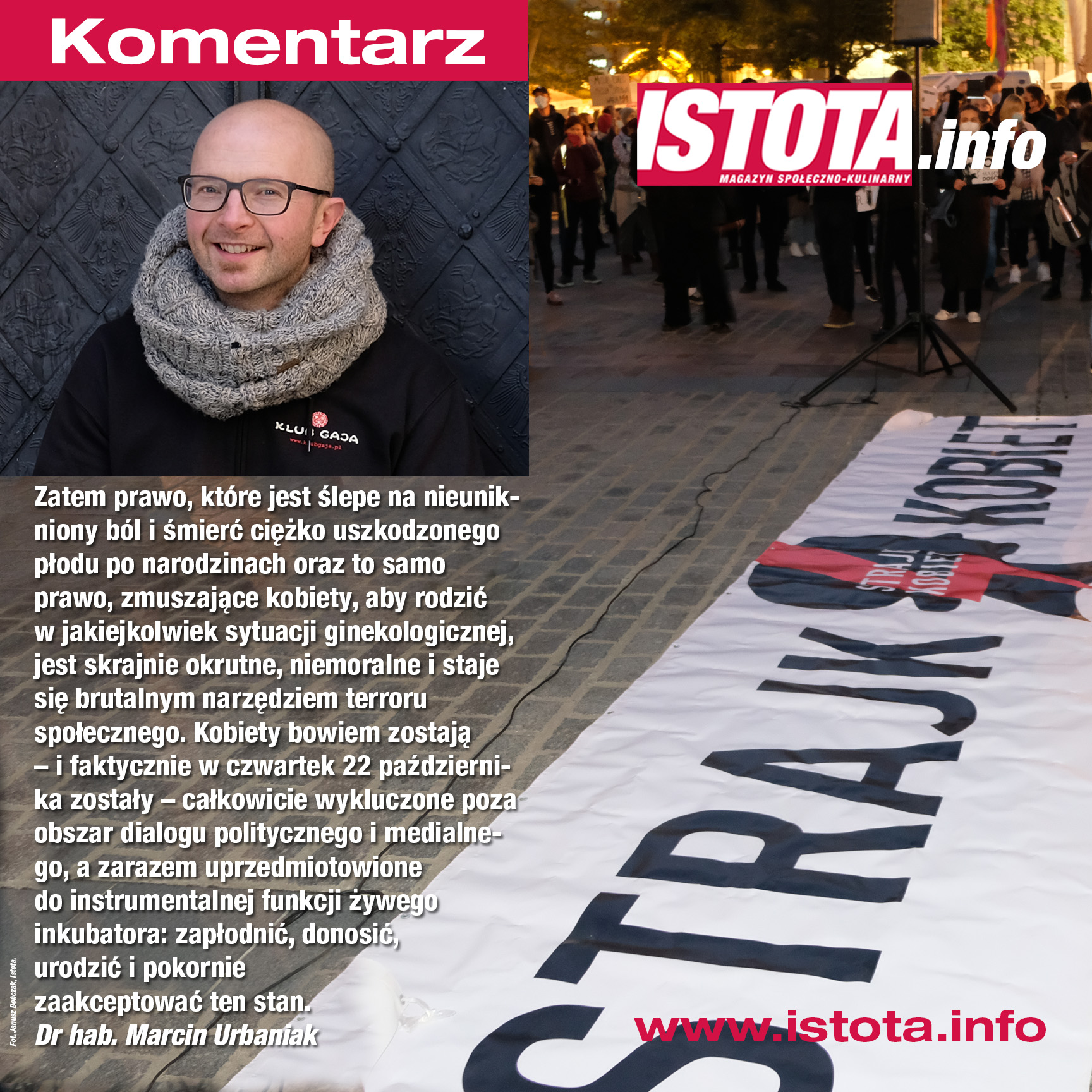 W czwartek 22 października 2020 Trybunał Konstytucyjny – piętnaście osób, będących z wykształcenia prawnikami – zadecydowało o zdrowiu i życiu kilkunastu milionów kobiet na okres co najmniej kilku najbliższych lat. Trybunał, wspierany pozytywnymi głosami pewnej grupy polityków, podjął decyzję o zakazie dokonywania aborcji ze względu na ciężkie uszkodzenie płodu, gdyż tak uzasadnione przerywanie ciąży jest sprzeczne z konstytucyjną zasadą ochrony życia. W praktyce oznacza to, przytaczając słowa pewnego ginekologa, m.in. odmówienie pacjentce wykonania terminacji ciąży „pomimo drastycznego wielowadzia płodu – rozszczepu kręgosłupa, obustronnego rozszczepu warg i podniebienia, poważnych wad serca i wad genetycznych”. Podkreślam, że te piętnaście osób, to prawnicy, bowiem ich wybór dotyczył biologicznych aspektów ontogenezy człowieka: określenia jakości życia embrionu i płodu, kwestii prenatalnych zaburzeń procesu rozwoju embrionu, a także zdrowia i życia psychofizycznego kobiety w okresie ciąży i po porodzie, wraz szacowaniem wartości zdrowia i życia – zarówno przyszłej matki, jak i rozwijającego się, przyszłego dziecka. Co szokujące, nie było żadnych specjalistycznych dyskusji ginekologów, embriologów, genetyków, patologów ani psychologów rodzinnych; nie było konsultacji społecznych z organizacjami, zajmującymi się pomocą psychologiczno-finansową samotnym matkom bądź rodzinom, których dziecko zmarło z przyczyn malformacji ciała. Nie dopuszczono w końcu do głosu same zainteresowane osoby, czyli kobiety – matki, przyszłe matki, kobiety w ciąży. Zakneblowano im usta, całkowicie ignorując i lekceważąc ich zdanie. Więc kobiety same zabrały głos i upomniały się o swoje prawa: