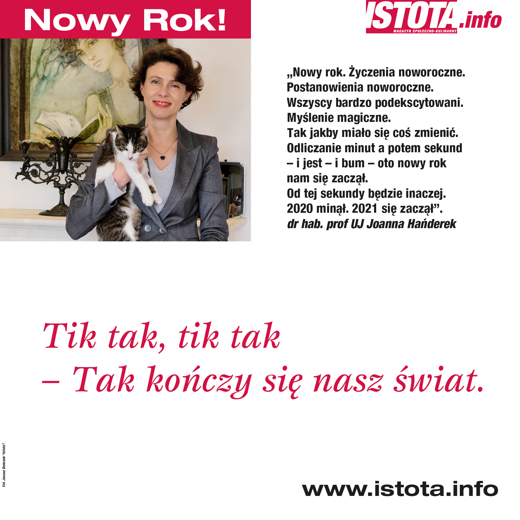 Nowy rok. Życzenia noworoczne. Postanowienia noworoczne. Wszyscy bardzo podekscytowani. Myślenie magiczne. Tak jakby miało się coś zmienić. Odliczanie minut a potem sekund – i jest – i bum – oto nowy rok nam się zaczął. Od tej sekundy będzie inaczej. 2020 minął. 2021 się zaczął.