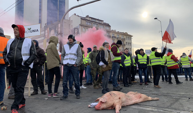 Ciało świni porzucone na ulicy, w nocy, jako protest. Rolnicy sprzeciwiają się w ten sposób temu, co uznają za własną krzywdę. Nie ma w tym proteście jednak szacunku dla samej tej świni. Jej się nie należy ani za życia spokój i uszanowanie jej potrzeb, tak samo jak jej ciało może po śmierci być dowolnie bezczeszczone. Świnia nie jest ważna, ważny jest sam człowiek, jego krzywda czy jego poczucie krzywdy. Co robi z innym zwierzęciem niż on sam znika wobec jego własnych potrzeb.