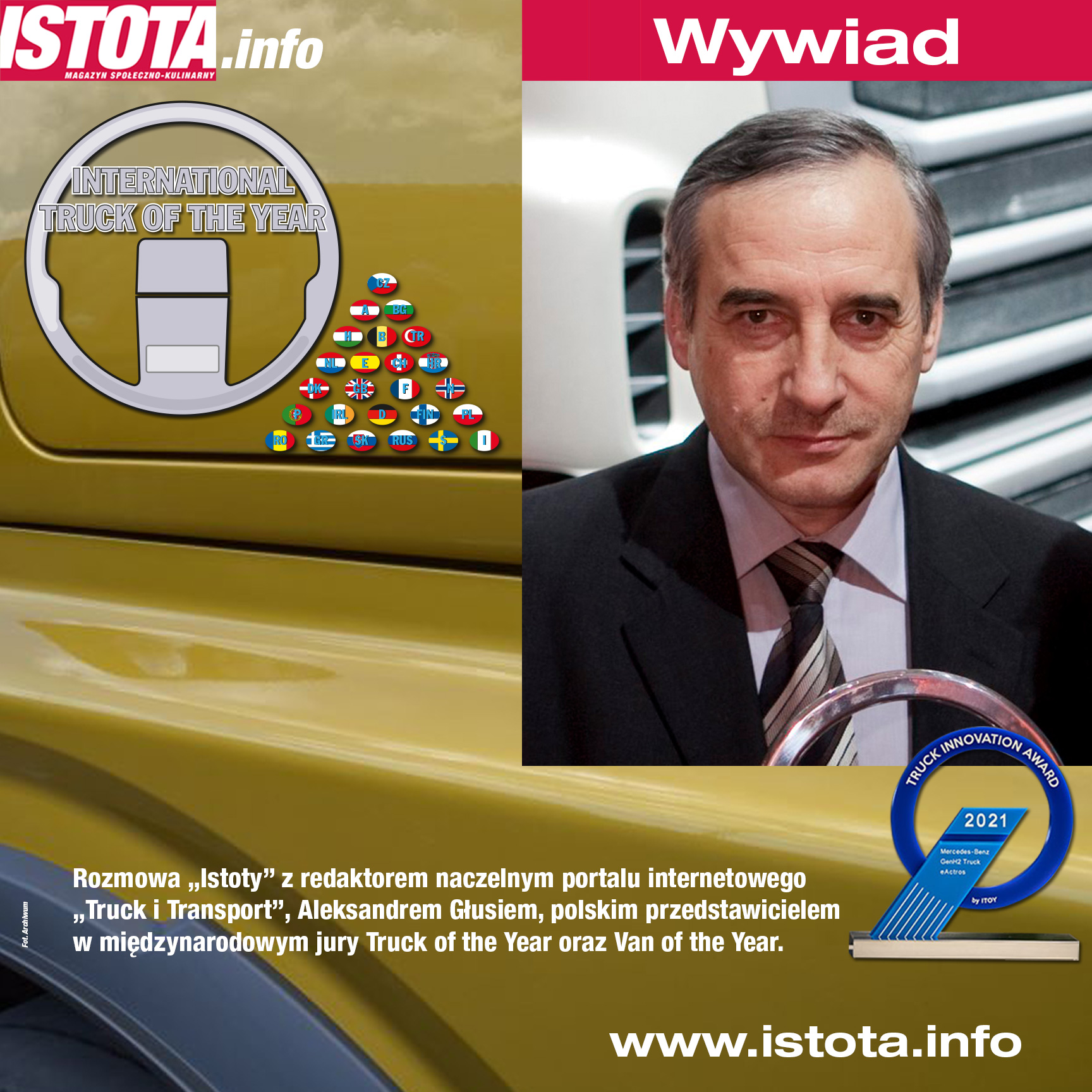 Rozmowa „Istoty” z redaktorem naczelnym portalu internetowego „Truck i Transport”, Aleksandrem Głusiem, polskim przedstawicielem w międzynarodowym jury Truck of the Year oraz Van of the Year.