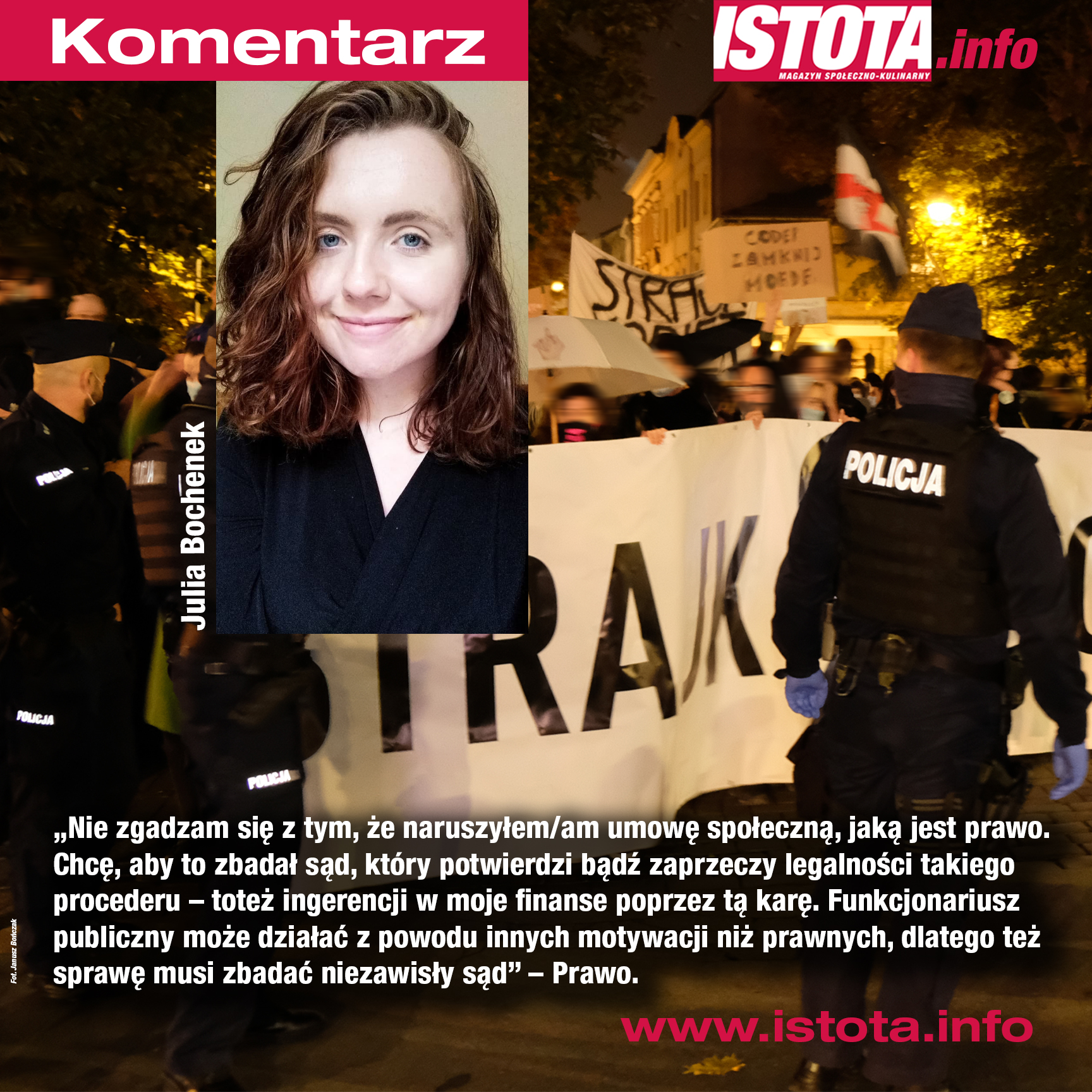„Nie zgadzam się z tym, że naruszyłem/am umowę społeczną, jaką jest prawo. Chcę, aby to zbadał sąd, który potwierdzi bądź zaprzeczy legalności takiego procederu – toteż ingerencji w moje finanse poprzez tą karę. Funkcjonariusz publiczny może działać z powodu innych motywacji niż prawnych, dlatego też sprawę musi zbadać niezawisły sąd”.