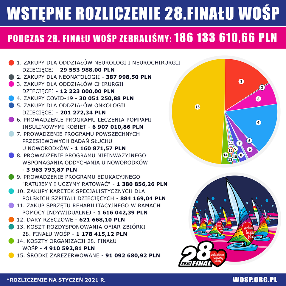 Tuż przed 29. Finałem WOŚP który odbędzie się 31 stycznia, Fundacja publikuje wstępne rozliczenie ubiegłorocznej zbiórki. Celem zbiórki 28. Finału WOŚP było zapewnienie najwyższych standardów diagnostycznych i leczniczych w dziecięcej medycynie zabiegowej. Podczas 28. Finału WOŚP zebrano 186 133 610,66 zł. W ramach zakupów, których udało się dokonać przed restrykcjami spowodowanymi pandemią koronawirusa Fundacja wydała 95 040 929,74 zł.
