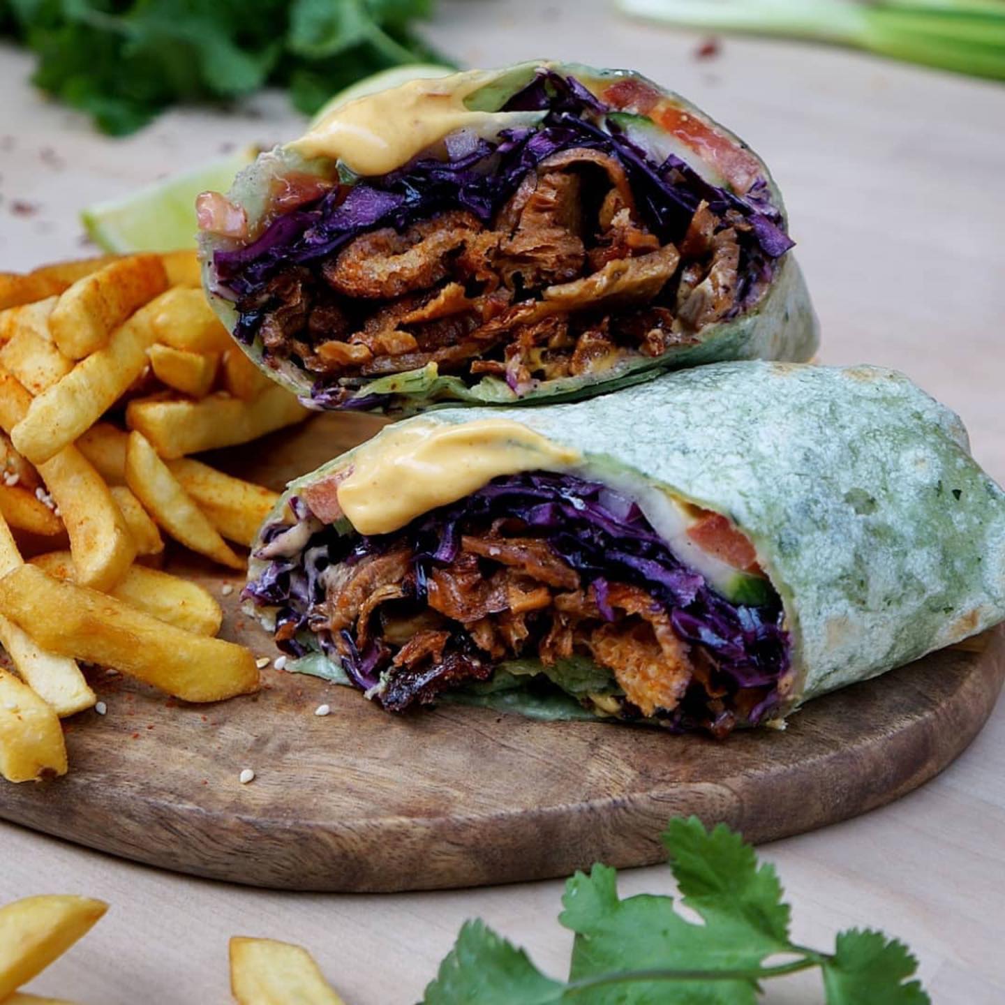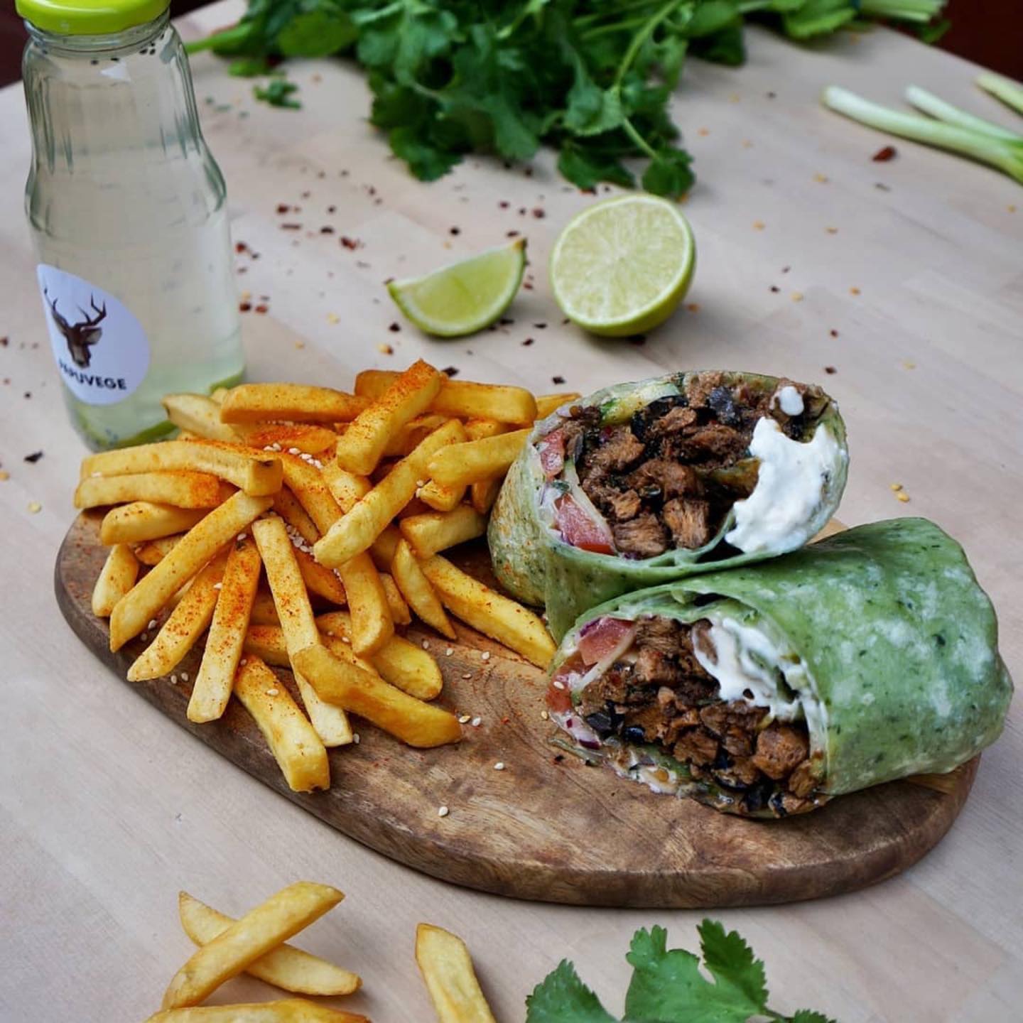 W zestawie znajdziesz tortillę Seitan oraz fryteczki z posypką z mielonego sezamu z shichimi togarashi i tajską lemoniadę z limonką i nasionami bazylii