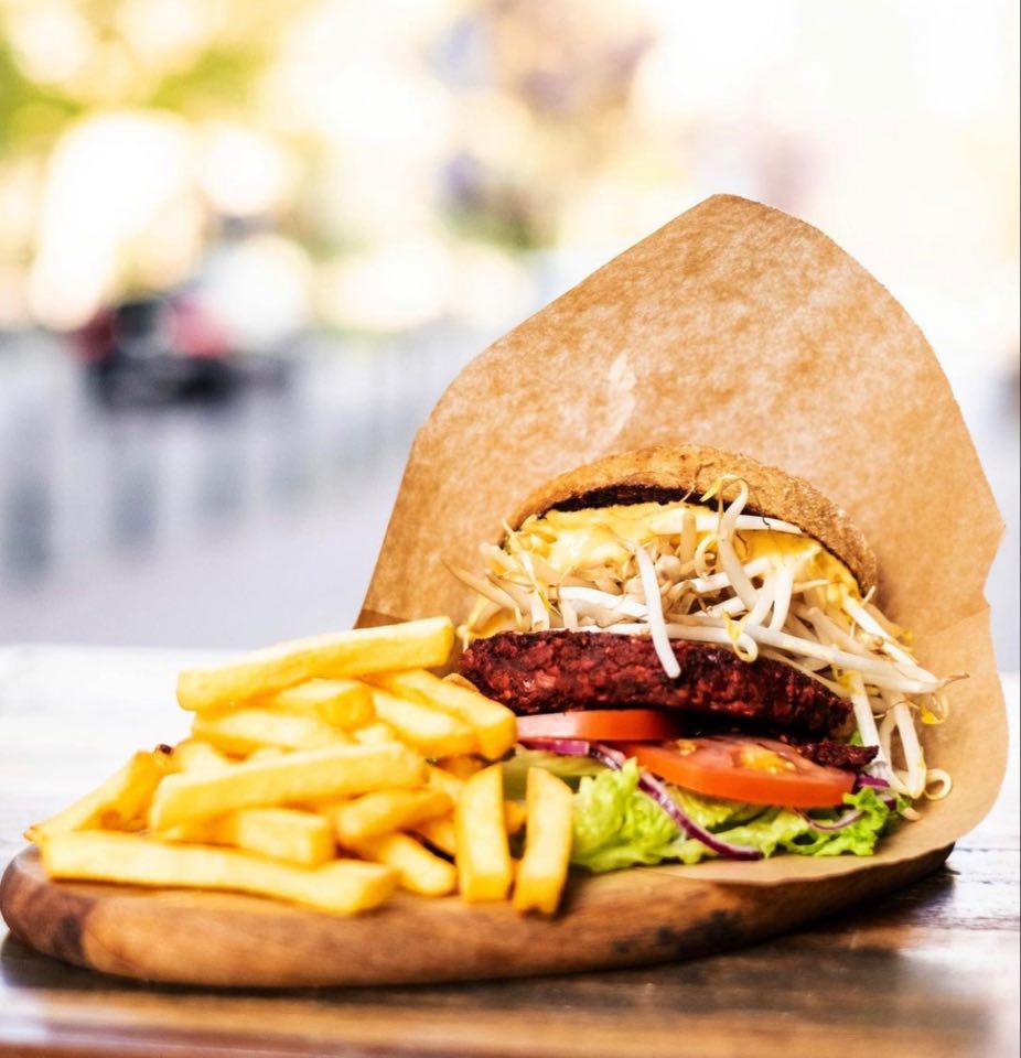 W zestawie znajdziesz burgera Buraczka oraz fryteczki z posypką z mielonego sezamu z shichimi togarashi i tajską lemoniadę z limonką i nasionami bazylii.