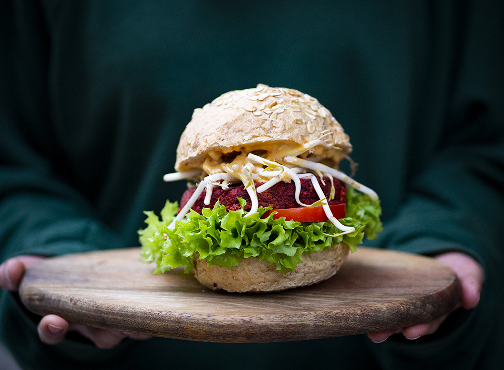 Kotlet z buraka, słonecznika i ryżu + kiełki fasoli mung, pomidor, czerwona cebula, sałata i sos curry