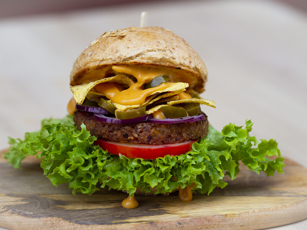 Kotlet „Linda McCartney” + pikle z ogórka, czerwona cebula, pomidor, sałata, sos BBQ i majonez