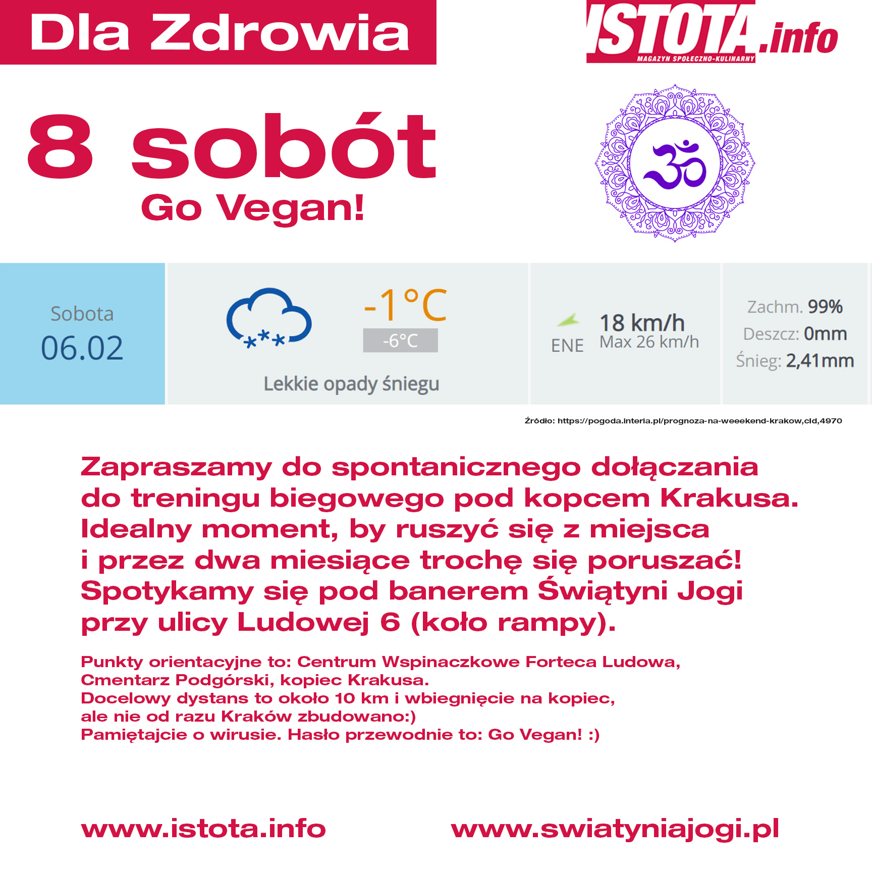 Wspomnę jeszcze o spontanicznym pomyśle, czyli jak będziecie mieć ochotę, to możecie dołączyć do mojego treningu biegowego w najbliższą sobotę… i w kolejne również. Startujemy o godzinie 9.00 sprzed wejścia do Świątyni Jogi przy ulicy Ludowej 6 w Krakowie.