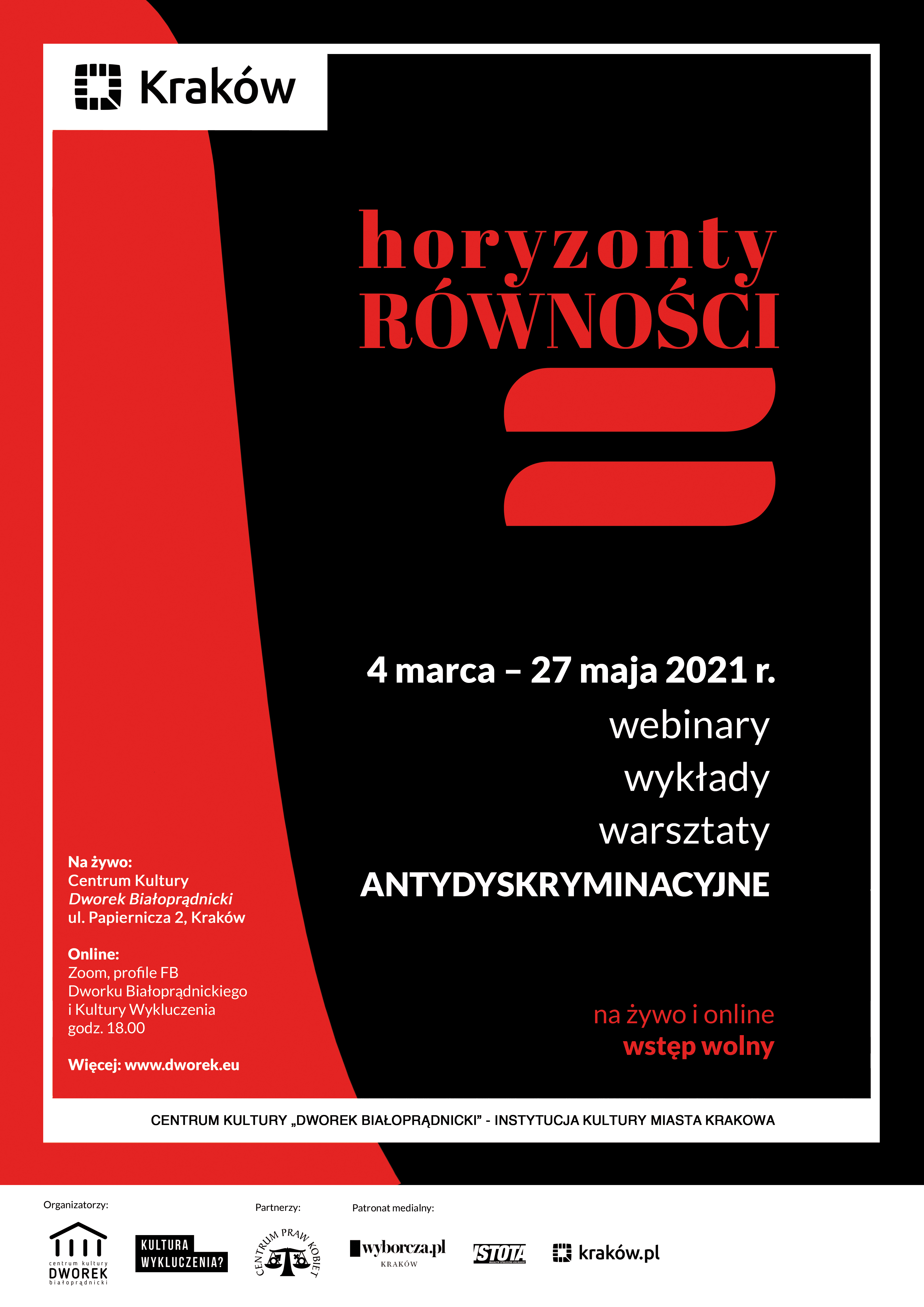 Centrum Kultury „Dworek Białoprądnicki” wraz „Kulturą wykluczenia?” od 4 marca rozpoczyna „Horyzonty równości”. To seria otwartych, bezpłatnych spotkań, wykładów i webinarów antydyskryminacyjnych, propagujących postawy dialogiczne, piętnujących język nienawiści, uczących języka dobrej mowy, wskazywania dobrych praktyk rozumienia różnorodności życia społecznego. Zaproszeni goście to specjaliści, wykładowcy, działacze społeczni a także artyści. Pełny program poniżej.