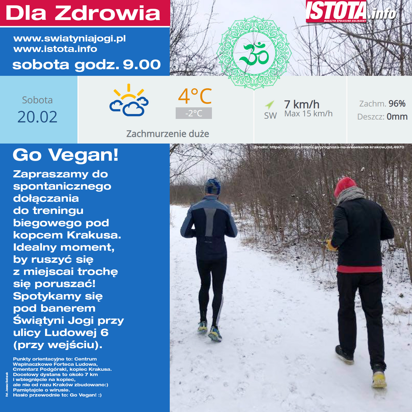 Start o godzinie 9.00. ul. Ludowa 6 (Podgórze) w Krakowie. Wejście do Świątyni Jogi