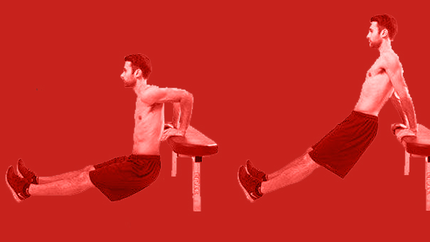 Proponuję pompki odwrotne, które nazywane są też pompkami szwedzkimi, lub po prostu „szwedkami”. Mała uwaga. W filmy instruktażowych zaleca się wsparcie dłoni na krawędzi ławeczki umieszczonej z tyłu za plecami. Prowadzi to do nienaturalnego wygięcia korpusu. Prościej i naturalniej jest oprzeć dłonie na dwóch taboretach ustawionych po obu stronach bioder.
