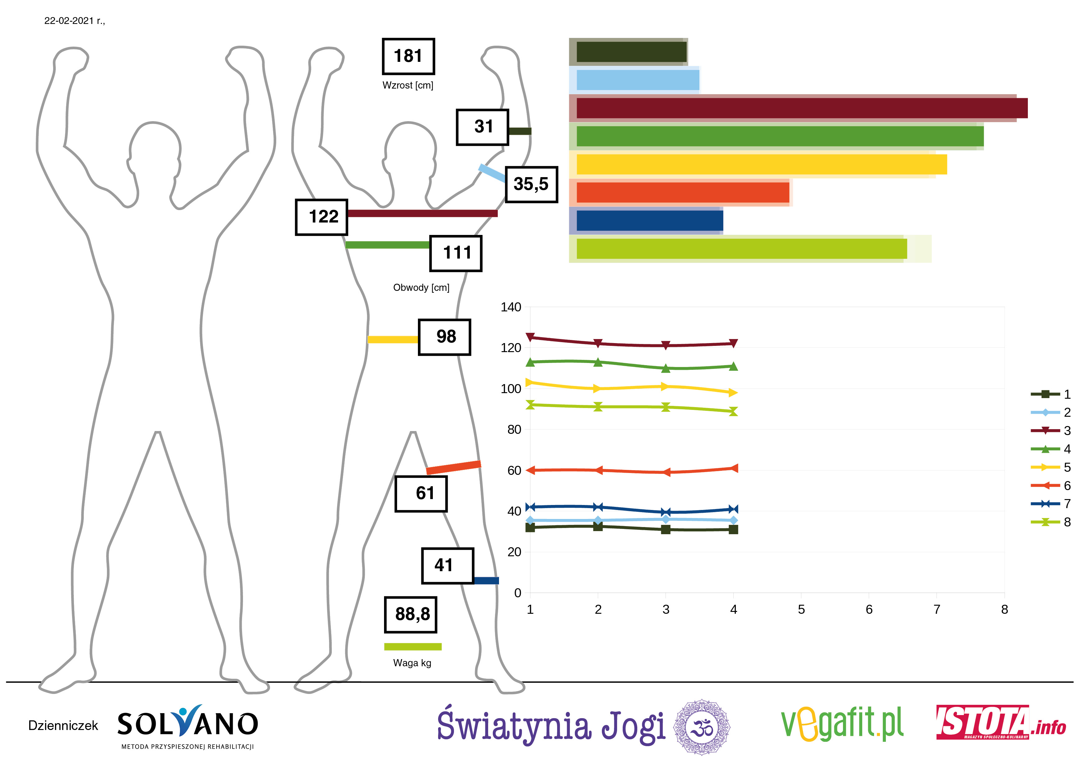 Kolejne „odmierzanie” rozpoczęło 4-tydzień treningów „Dla Zdrowia” w Świątyni Jogi w Krakowie. Nie nachalnie, ale sukcesywnie moja waga spada (takie było założenie treningowe). Przy minimalnym wysiłku jaki włożyłem w ćwiczenia, już jest mnie mniej o 4 kg. Talia jeszcze nie jak u osy, ale kilka centymetrów urwane. I co najważniejsze, czuję się zdrowo. Jest to bardzo przyjemne, gdy widzę, że moje ciało z tygodnia na tydzień radzi sobie coraz lepiej z różnymi pozycjami podczas ich wykonywania. Nadchodzący tydzień ma być bardziej intensywny, ale jednak nadal dostosowany do moich możliwości fizycznych. Trener Marcin pochwalił się, że znów zjadł obiad wegański, więc plan zmiany jego diety z wegetariańskiej na wegańską, generalnie jest rozwojowy. Zapraszam Was do ruchu, nawet tego mało intensywnego. Klucz to systematyczność. Powodzenia! jb.