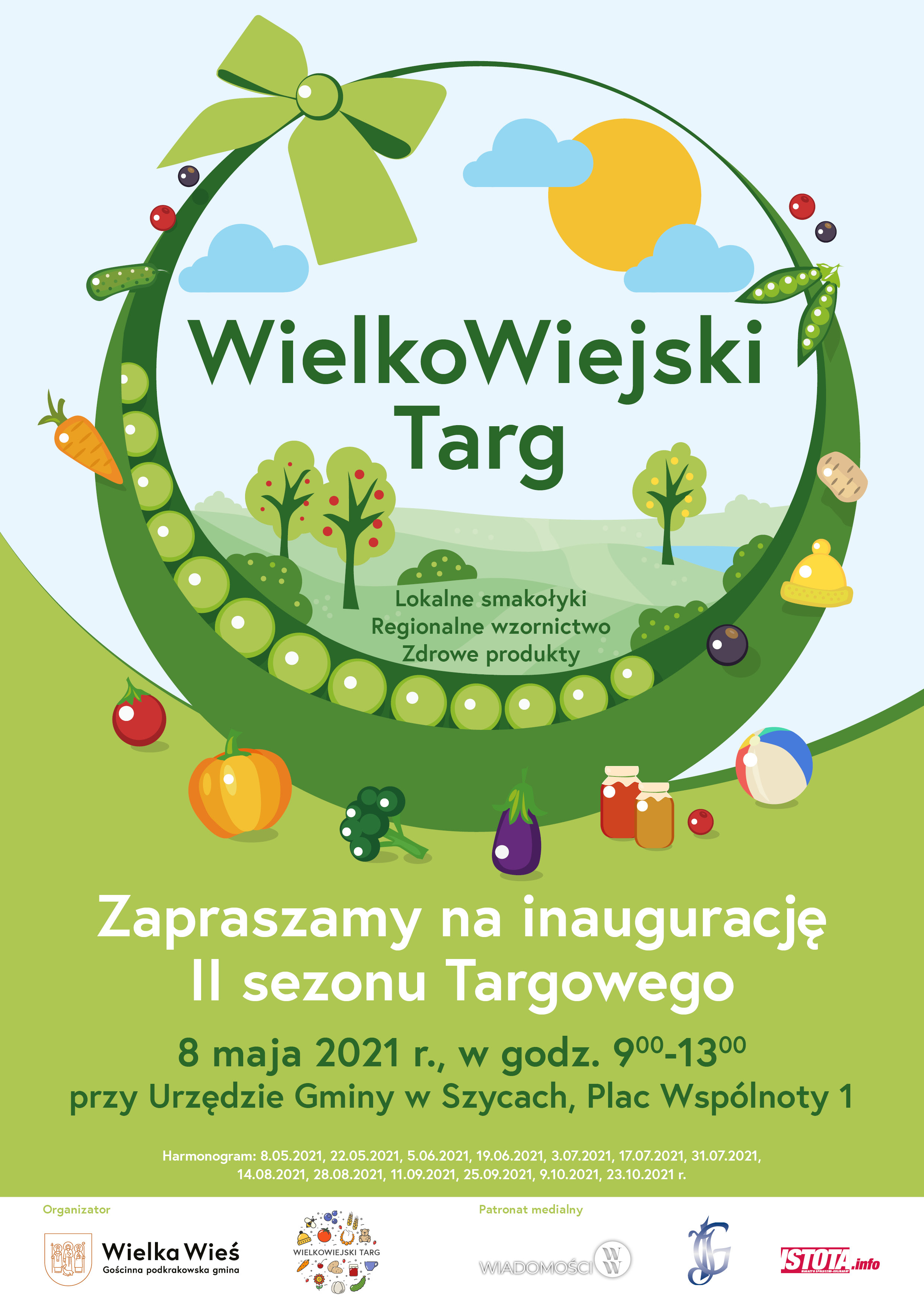 W imieniu Gminy Wielka Wieś, serdecznie zapraszamy rolników, sadowników, wytwórców oraz rękodzielników z terenu Gminy, do udziału w Wielkowiejskim Targu 2021. Przypominamy: startujemy 8.05 br. o godz. 9.00, a następnie cyklicznie (co dwa tygodnie do 23 października). Liczba miejsc targowych jest ograniczona!