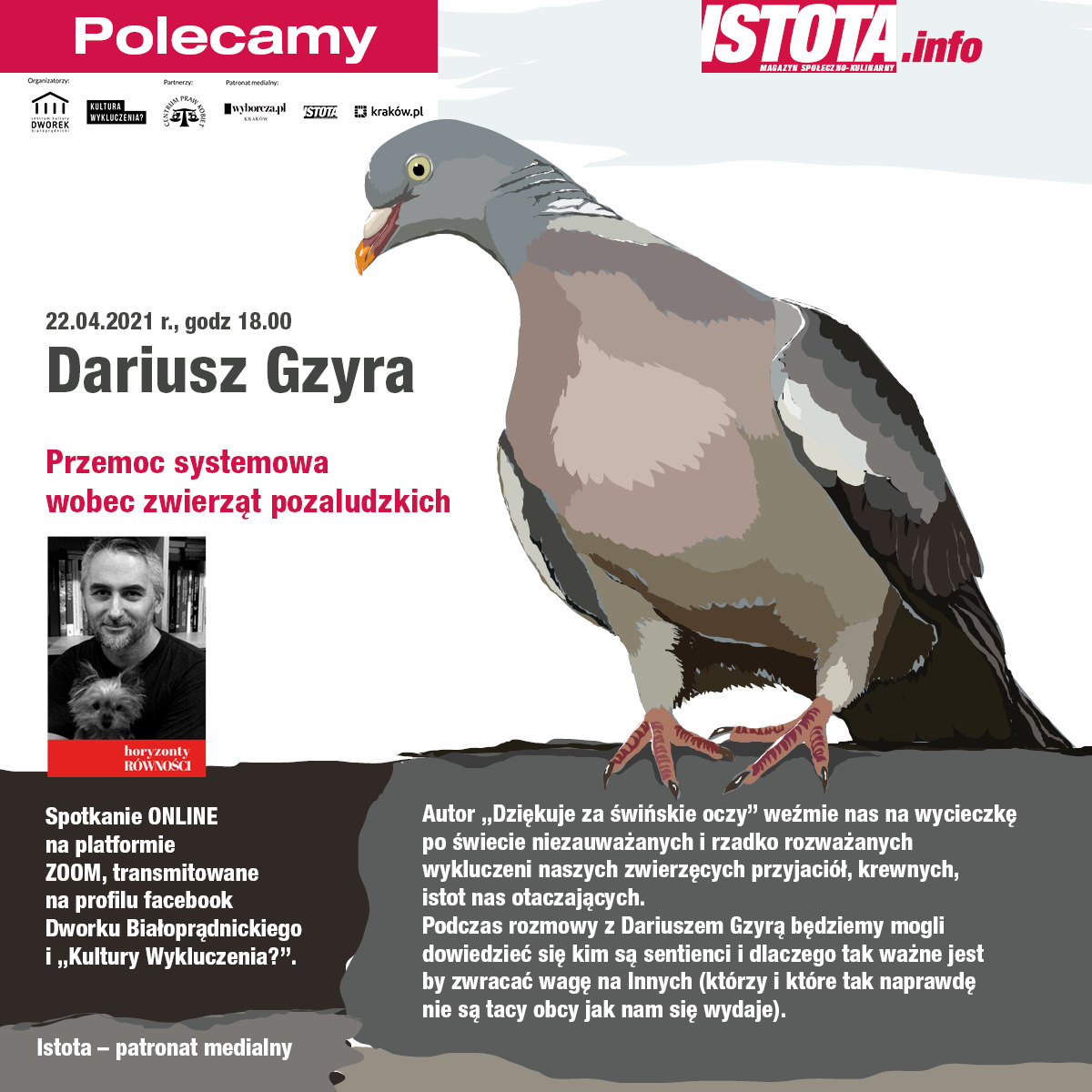 Dziś (22.04.2021 r.), o godzinie 18.00 zapraszamy na spotkanie z Dariuszem Gzyrą, który będzie mówił o przemocy systemowej wobec zwierząt pozaludzkich”.