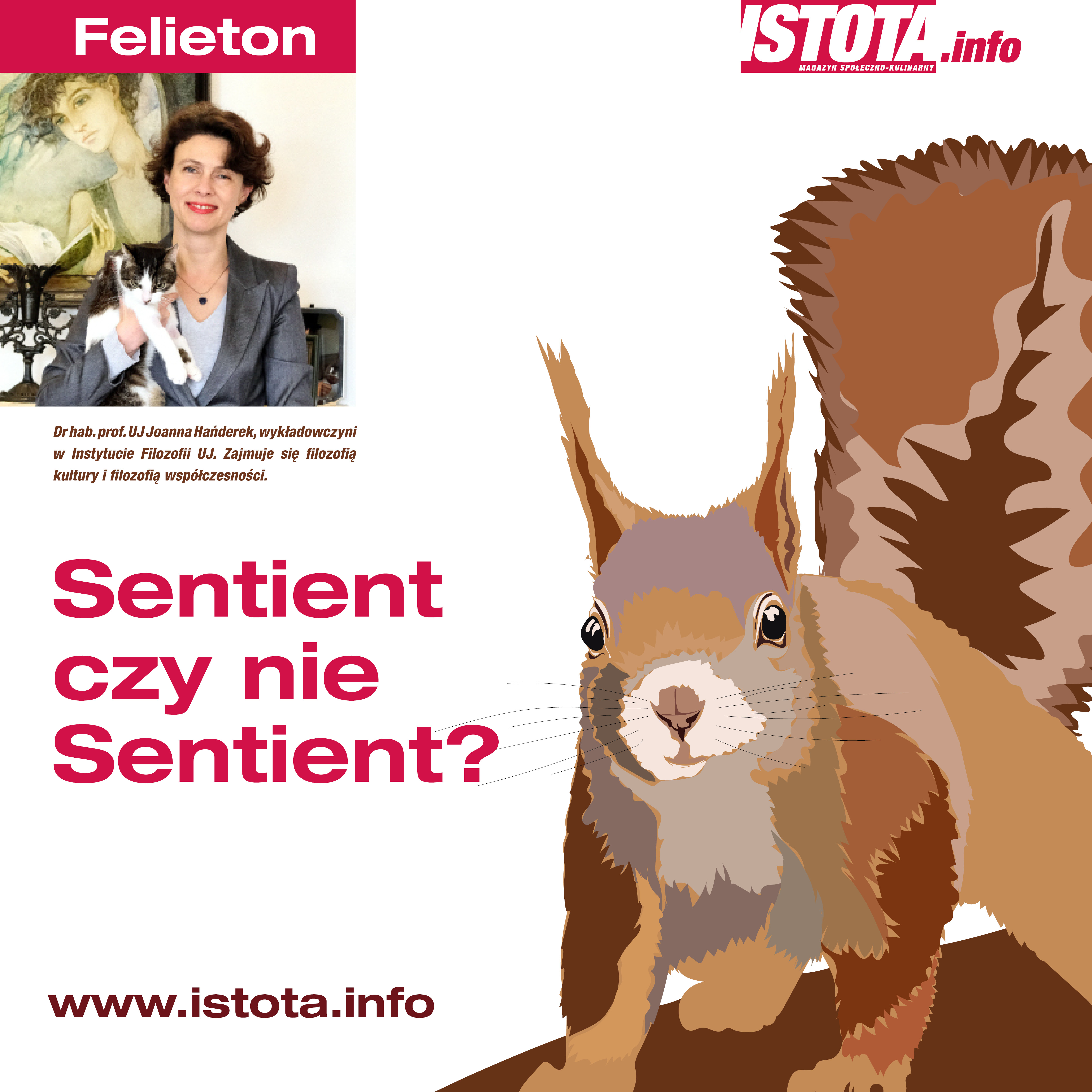 Dr hab. prof. UJ Joanna Hańderek, wykładowczyni w Instytucie Filozofii UJ. Zajmuje się filozofią kultury i filozofią współczesności. Od 2013 roku organizuje cykl wykładów i spotkań poświęconych różnym formom dyskryminacji społecznych „Kultura wykluczenia?”. Współredaktorka kwartalnika popularnonaukowego „Racje”, członkini Towarzystwa Humanistycznego, Akademickiego Stowarzyszenia przeciwko Myślistwu Rekreacyjnemu, Kongresu Świeckości, członkini rady głównej Kongresu Kobiet. Z kotką na kolanach pisze filozoficznego bloga