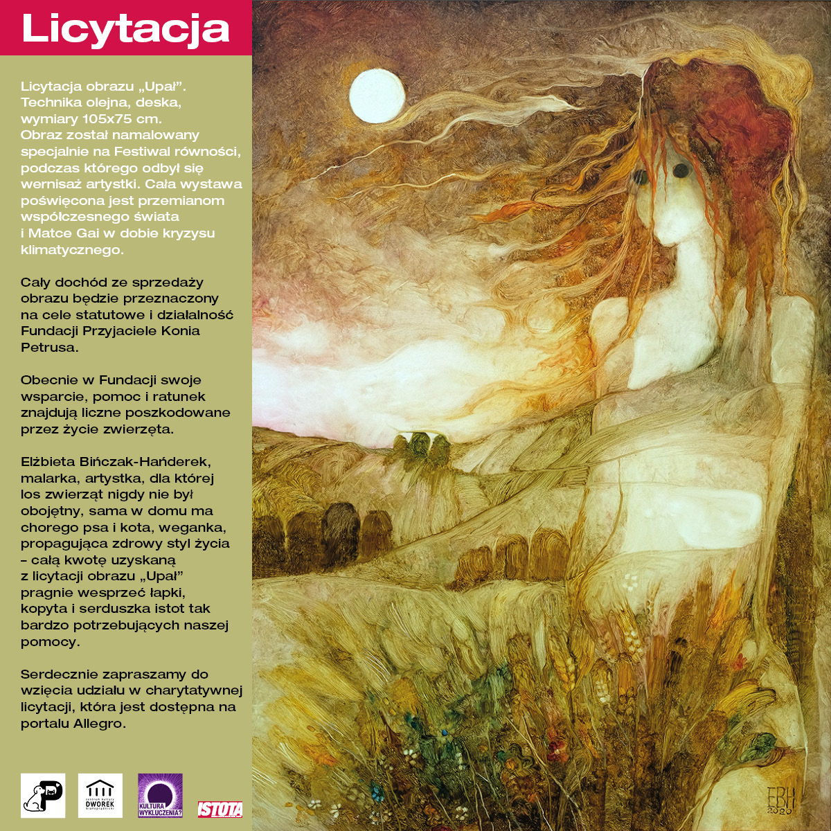 Cały dochód ze sprzedaży obrazu będzie przeznaczony na cele statutowe i działalność Fundacja Przyjaciele konia Petrusa.