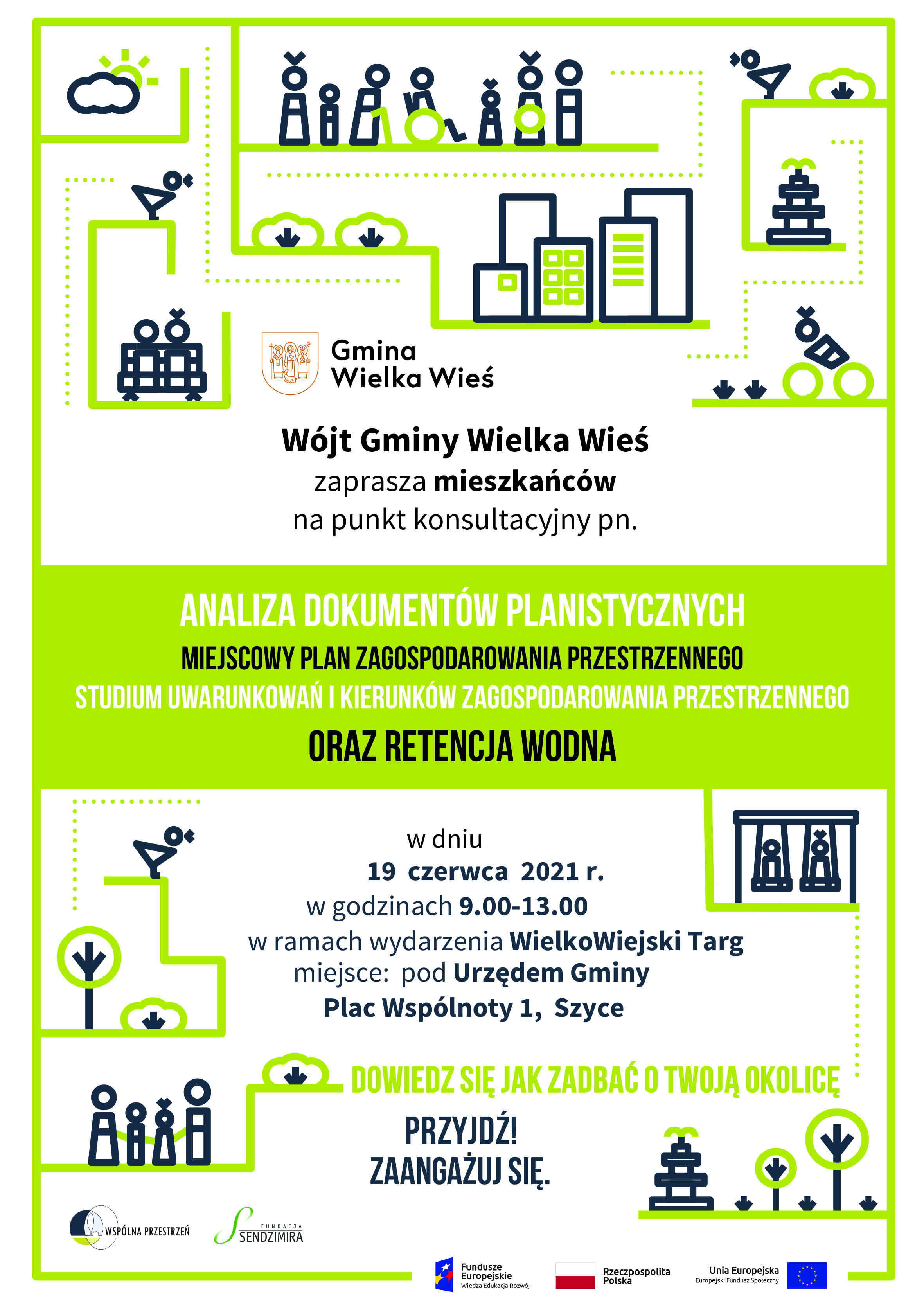 Wójt Gminy Wielka Wieś zaprasza mieszkańców na punkt konsultacyjny pn.: Analiza dokumentów planistycznych, miejscowy plan zagospodarowania przestrzennego, studium uwarunkowań i kierunków zagospodarowania przestrzennego oraz retencja wodna.