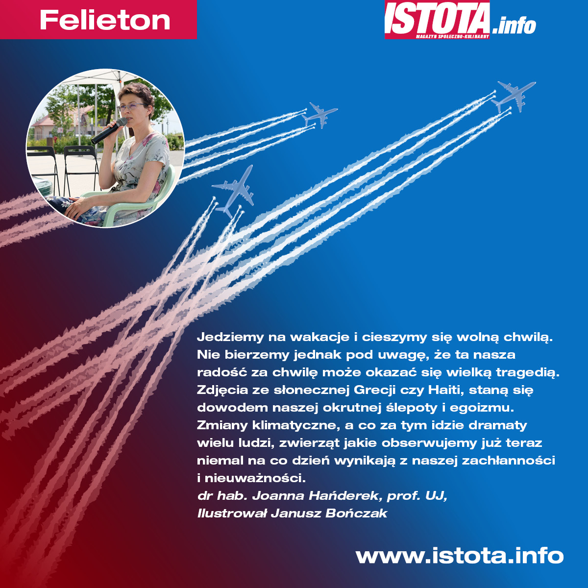 Jedziemy na wakacje i cieszymy się chwilą wolną. Nie bierzemy jednak pod uwagę, że ta nasza radość za chwilę może okazać się wielką tragedią. Zdjęcia ze słonecznej Grecji czy Haiti, staną się dowodem naszej okrutnej ślepoty i egoizmu. Zmiany klimatyczne, a co za tym idzie dramaty wielu ludzi, zwierząt jakie obserwujemy już teraz niemal na co dzień wynikają z naszej zachłanności i nieuważności. Tak bardzo uwierzyliśmy reklamom, że to nam się należy, że tego jesteśmy warci, że zamykamy się na fakty, jakie mówią do nas bardzo wyraźnie. Jeżeli nie zatrzymamy emisji gazów cieplarnianych, jeżeli nie zmienimy naszych przyzwyczajeń żywieniowych, spędzania wolnego czasy, zabawy, jeżeli nie zmienimy naszego konsumpcyjnego podejścia do świata grozi nam, że już za chwilę nie będziemy mieli szans na przetrwanie.
