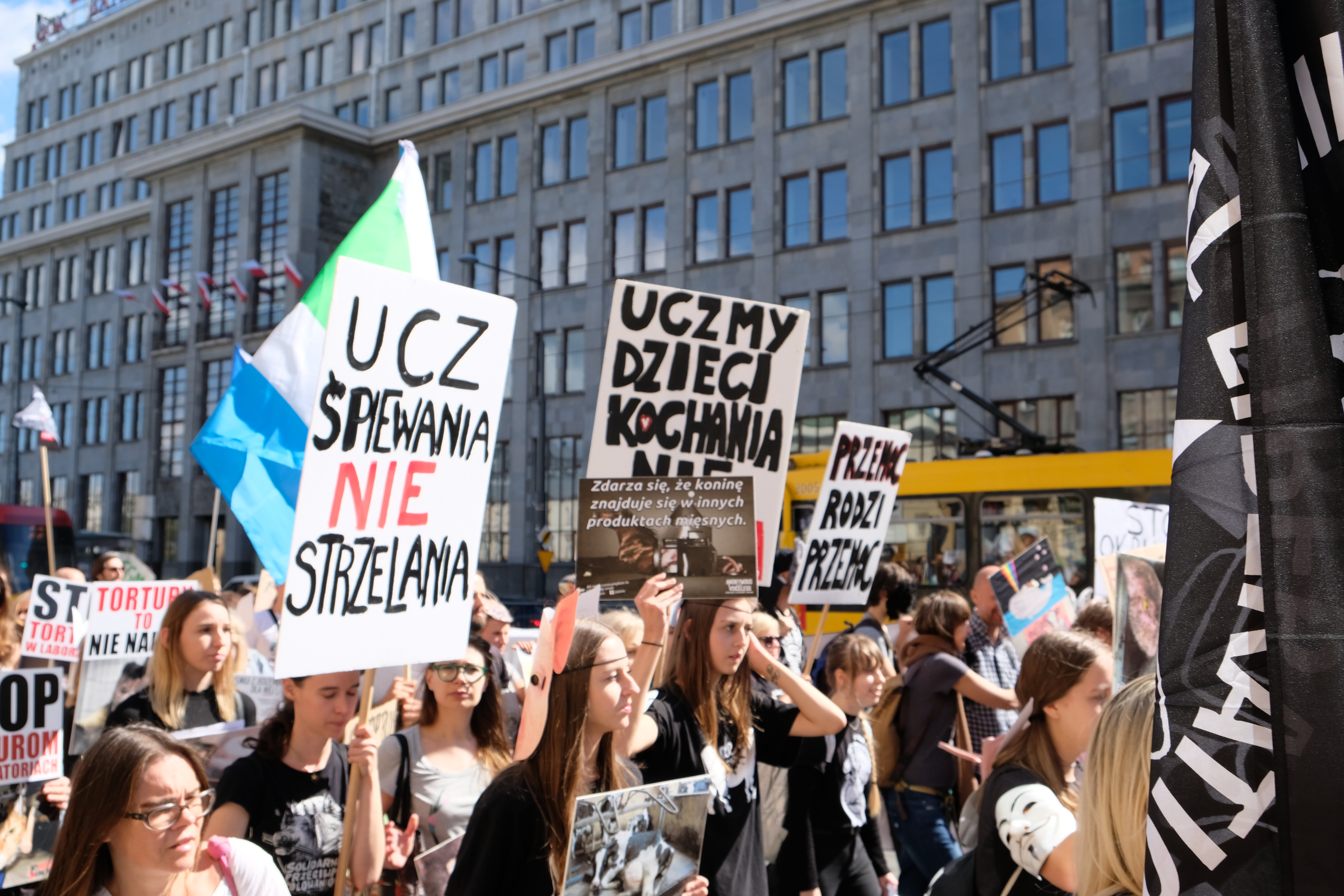 Jako edukator społeczny i nauczyciel obserwuję, że dużej części społeczeństwa brakuje głównie motywacji, aby porzucać szkodliwe nawyki konsumpcyjne, które napędzają okrutne praktyki wobec zwierząt. Z kolei reprezentantom politycznym często brakuje chęci, odwagi lub konsekwencji, aby skutecznie, systemowo ograniczać bestialskie formy eksploatacji zwierząt. Na obecnym Marszu nie ma nikogo z Parlamentarnego Zespołu Przyjaciół Zwierząt. Nie ma liderów partii politycznych, których posłowie zasiadają w Sejmie. To bardzo przygnębiające i symptomatyczne. Osoby oraz instytucje decyzyjne, mające realną moc wprowadzania zmian systemowych na gruncie prawno-politycznym, wciąż nie potrafią wyciągnąć moralnych wniosków z wiedzy, którą dysponujemy. A przecież wszyscy doskonale wiemy, że jesteśmy zwierzętami! Nasz Marsz Wyzwolenia Zwierząt dotyczy również nas samych – bezpośrednio i dosłownie. Żeby przezwyciężyć wspomniany brak motywacji, brak chęci i odwagi do zmian oraz polityczny marazm, w pierwszej kolejności musimy sami się wyzwolić!! Z czego? Z archaicznych mitów o rzekomej wyjątkowości gatunku ludzkiego; z destrukcyjnych nawyków mięsno-nabiałowych i przyzwyczajeń np. odzieżowych (mam na myśli naturalne futra, wełnę, pierze). Z przyzwyczajeń rozrywkowych, jak cyrki i papugarnie, czy z pozornie błahych nawyków koszenia trawy do gołej ziemi i grabienia liści jesienią – to zgubny nawyk sterylnego porządkowania i kontrolowania przyrody, ale też niechęć do dzikości. Musimy w końcu wyzwolić się z prymitywnej tradycji, która jest pełna bólu i bezsensownej śmierci: a więc z polowań, wędkowania, z wypuszczania białych gołębi podczas ceremonii ślubnej lub zaprzęgania koni do fiakrów i dorożek.