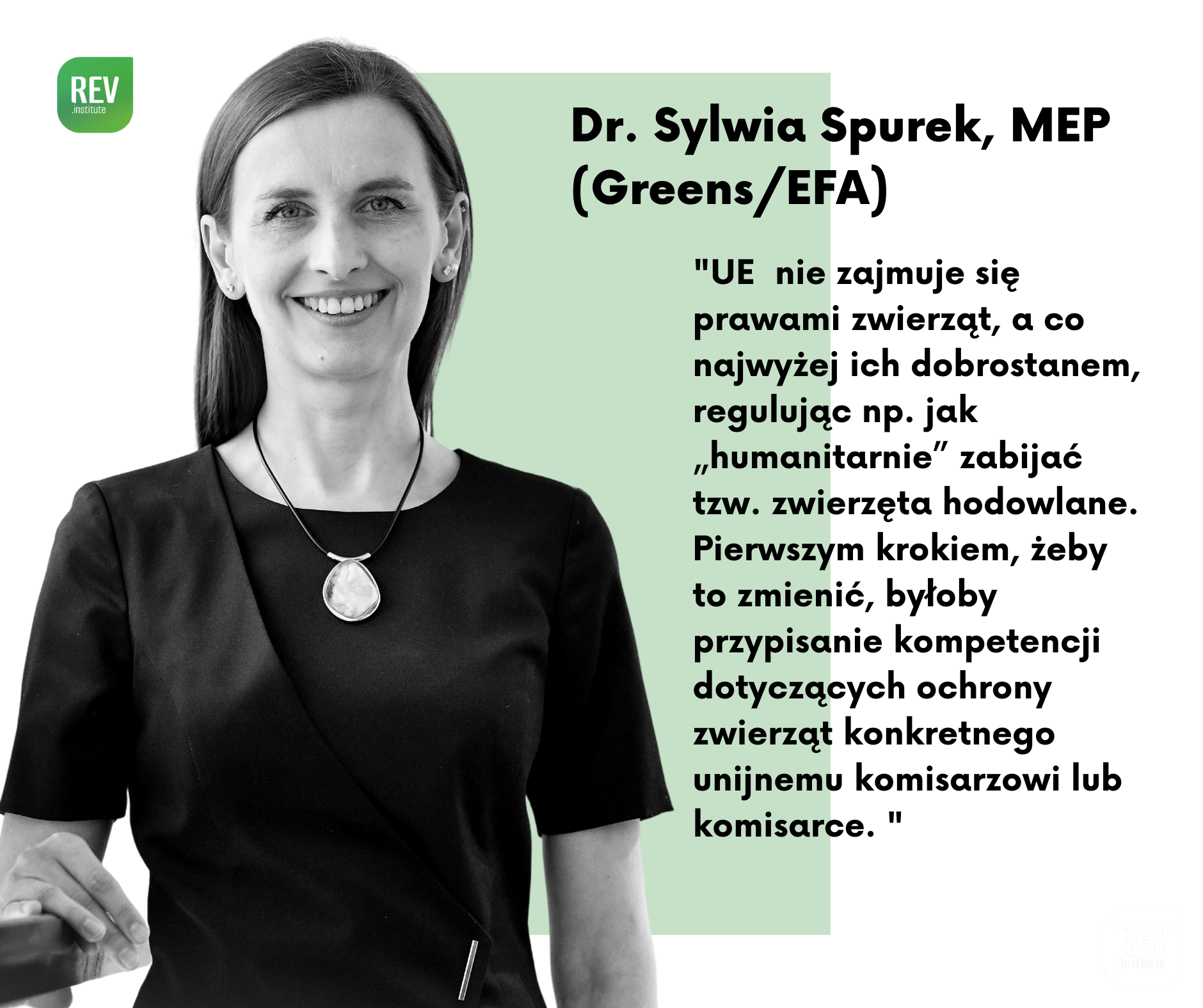 Dr. Sylwia Spurek Posłanka do PE (Greens/EFA): „Unia Europejska nie zajmuje się prawami zwierząt, a co najwyżej ich dobrostanem, regulując jak „humanitarnie” eksploatować i „humanitarnie” zabijać zwierzęta tzw. hodowlane. Pierwszym krokiem, żeby to zmienić byłoby przypisanie kompetencji dotyczących ochrony zwierząt konkretnemu unijnemu komisarzowi lub komisarce. Stąd nasz apel do KE. #AnimalCommissionerNOW”