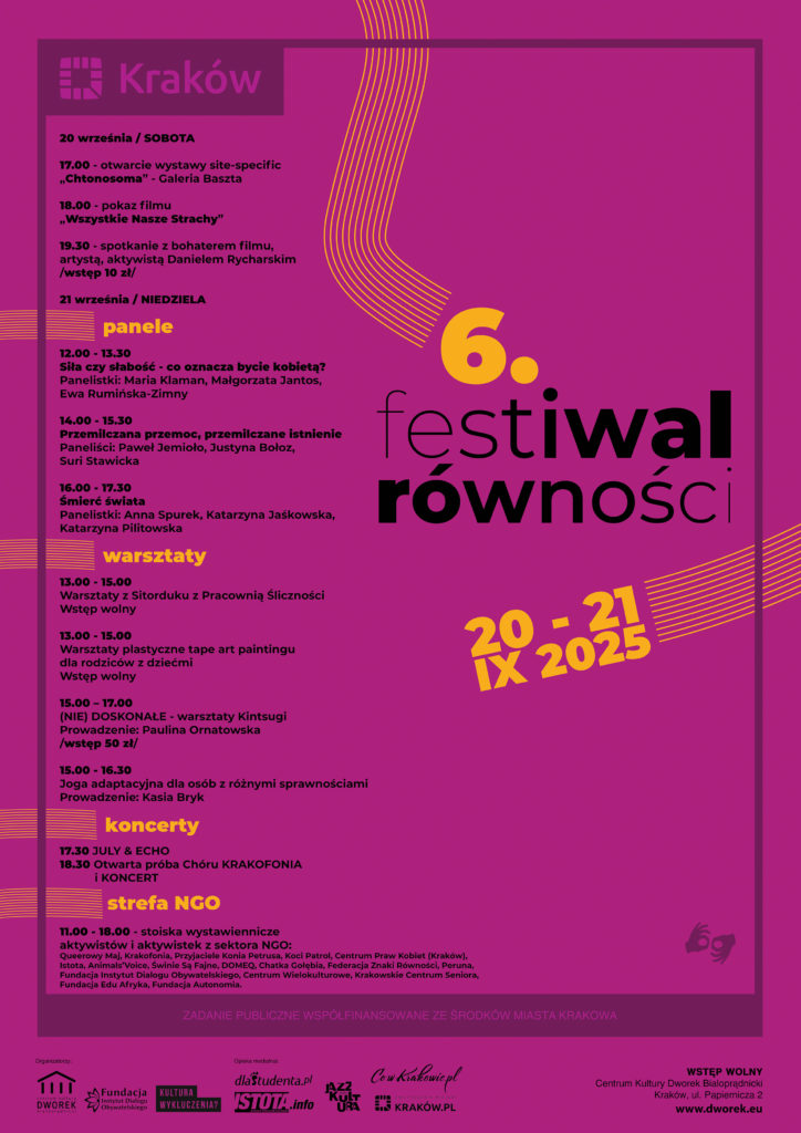 W dniach 20 i 21 września 2025 roku w Centrum Kultury „Dworek Białoprądnicki” odbędzie się szósta edycja Festiwalu Równości, podczas którego dyskutujemy o ideach i praktykach w zakresie wolności i równości. Mówimy o mniejszościach, wielokulturowości, przeciwdziałamy wykluczeniom i zachęcamy do inkluzywności na poziomie języka i codziennej egzystencji, a także do wnikliwego rozumienia różnorodności zjawisk społecznych na poziomie jednostek i wspólnot.