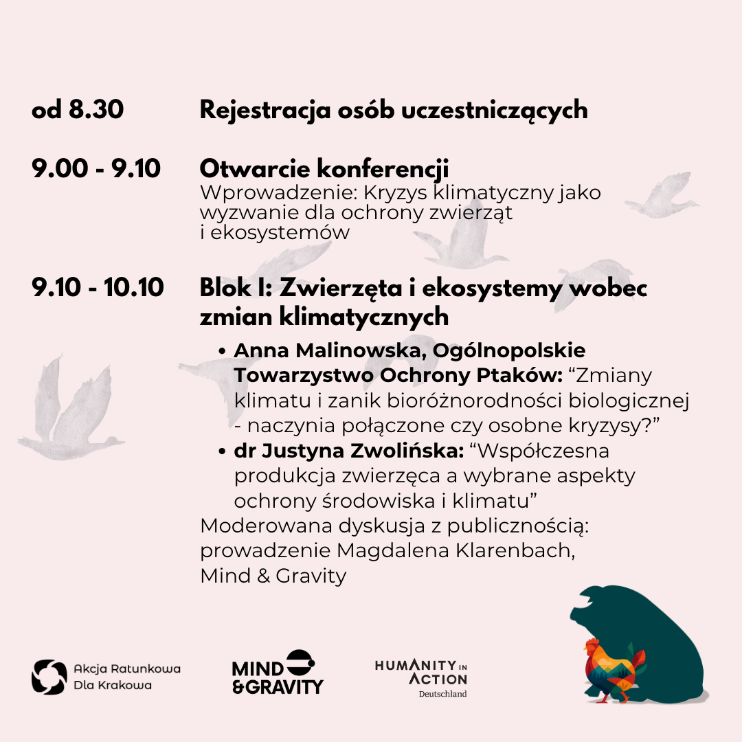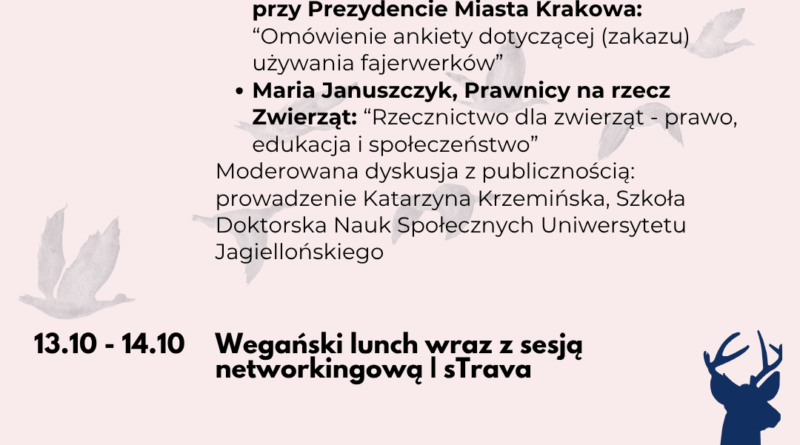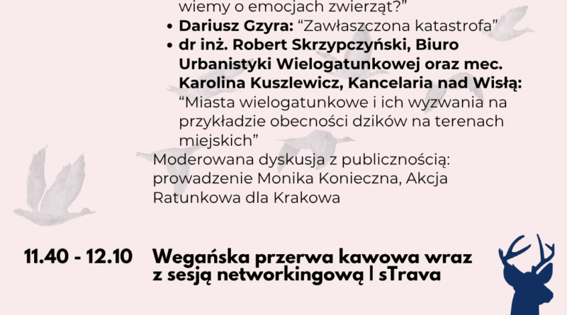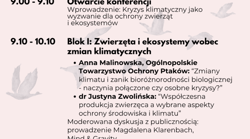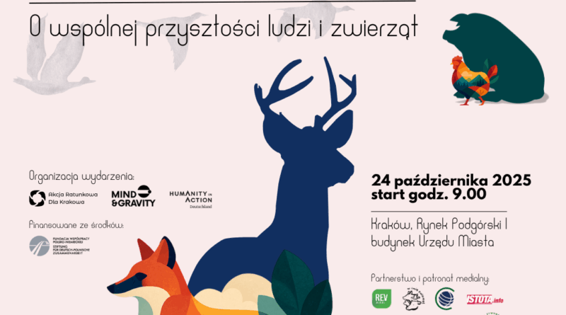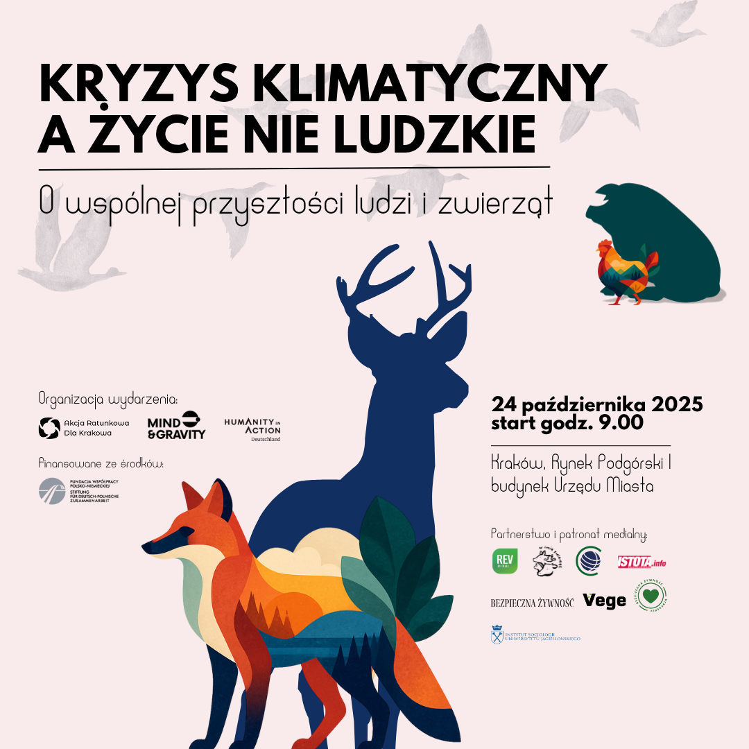 W piątek 24 października 2025 roku w godzinach od 9:00 do 15:00 na Rynku Podgórskim w Krakowie odbędzie się konferencja „Kryzys klimatyczny, a życie nie-ludzkie: O wspólnej przyszłości ludzi i zwierząt”. Wydarzenie potrwa sześć i pół godziny i będzie otwarte dla wszystkich zainteresowanych. Spotkanie ma charakter interdyscyplinarny i zostanie poświęcone refleksji nad skutkami kryzysu klimatycznego dla istot nie-ludzkich oraz możliwościami budowania etycznych, sprawiedliwych i zrównoważonych relacji międzygatunkowych. W programie znajdą się zagadnienia dotyczące zwierząt i ekosystemów wobec zmian klimatycznych, świadomości i prawa do współistnienia, narzędzi prawnych i społecznych ochrony zwierząt, a także praktycznych rozwiązań i innowacji.