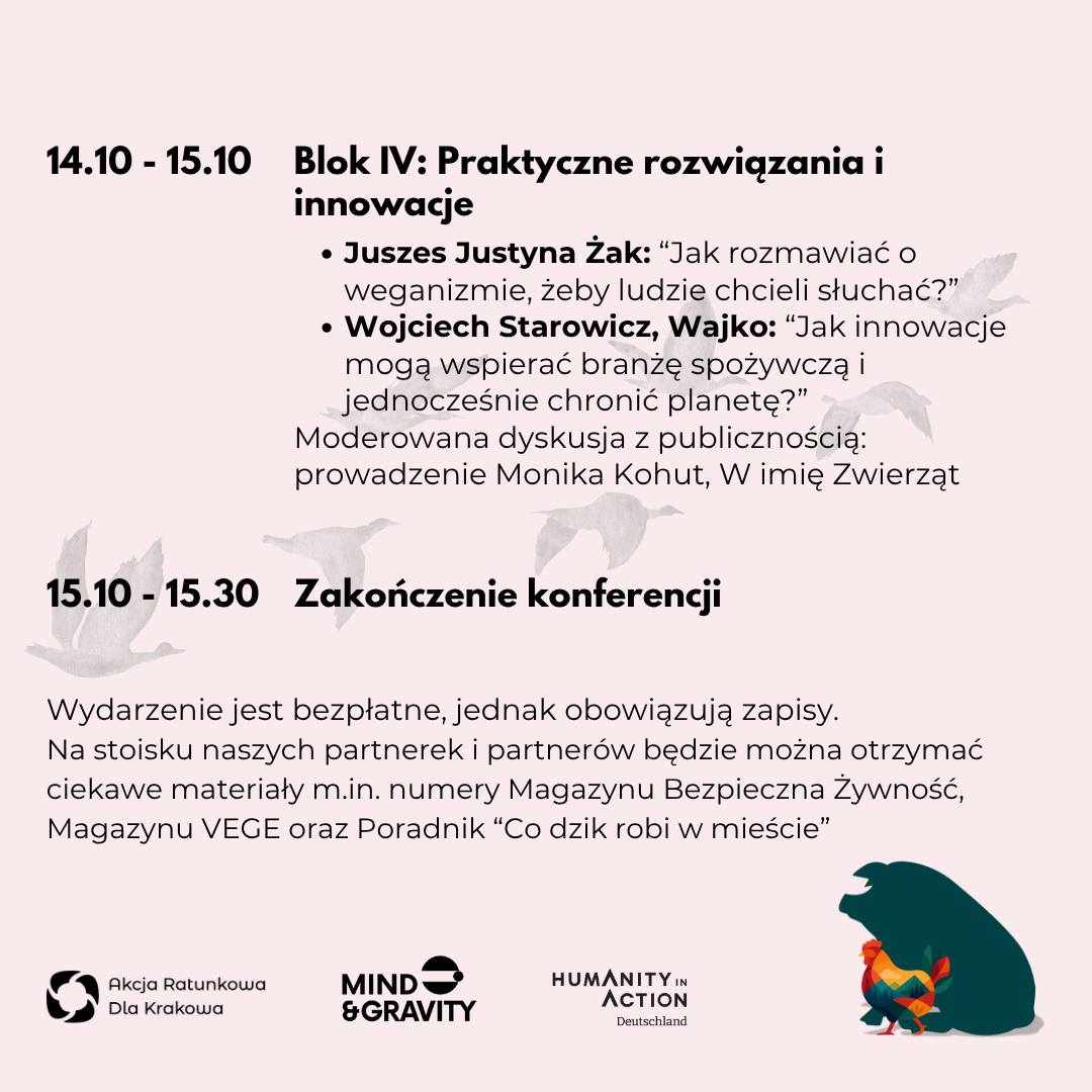 Organizatorami wydarzenia są Fundacja Mind & Gravity, Fundacja Humanity in Action oraz Stowarzyszenie Akcja Ratunkowa dla Krakowa, a patronat medialny objął Magazyn ISTOTA. Udział w konferencji jest bezpłatny, ale obowiązują wcześniejsze zapisy poprzez formularz dostępny pod adresem: formularz zgłoszeniowy. Liczba miejsc jest ograniczona, a potwierdzenie uczestnictwa należy przesłać do 15 października 2025 roku. Wydarzenie finansowane jest ze środków Fundacji Współpracy Polsko-Niemieckiej, a wegański catering zapewni cukiernia i firma sTrava.